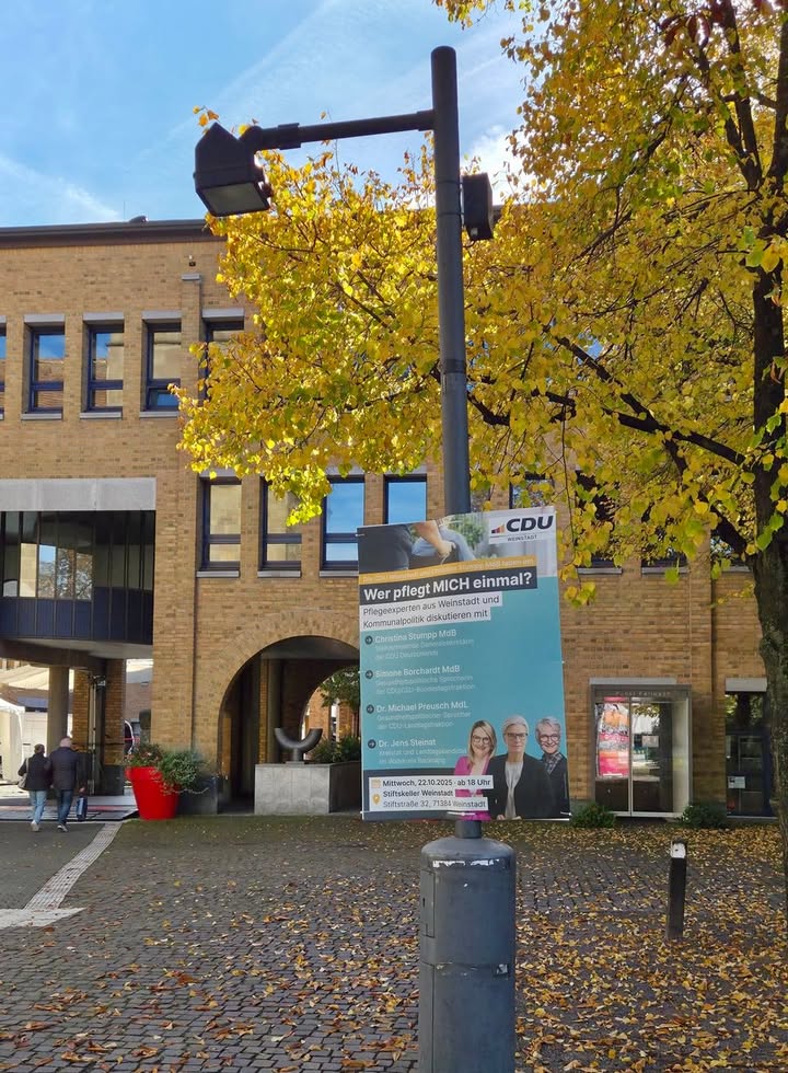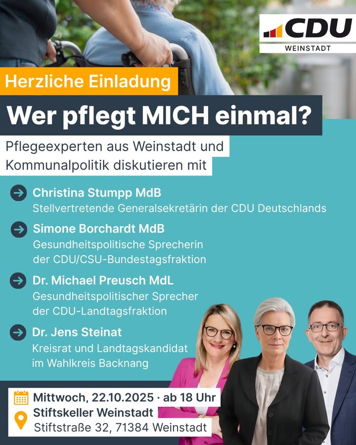 mehrEinladung zum Pflegesymposium am 22.10.2025 mit Simone Borchardt MdBChristina Stumpp MdB, Karin Gaiser, Vorsitzende der CDU Weinstadt, und Dr. Jens Steinat, Kreisrat und Landtagskandidat des Wahlkreises Backnang, laden Sie herzlich ein am Mittwoch, 22. Oktober 2025, von 18:30 bis 20:00 Uhr im Stiftskeller Weinstadt-Beutelsbach (Stiftstraße 32, 71384 Weinstadt) gemeinsam mit den Ehrengästen zu diskutieren. Die wichtige Frage "Wer pflegt MICH einmal?" gewinnt zunehmend an Dringlichkeit, denn die alternde Gesellschaft stellt das Gesundheitssystem und damit uns alle vor enorme Herausforderungen. Lösungen sind gefragt! Unser gemeinsamer Anspruch und Wille muss sein, dass Menschen trotz Pflege- und Unterstützungsbedarf in Würde alt werden können. Es braucht Erneuerung, um den demografischen Wandel in Kombination mit dem Fachkräftemangel begegnen zu können. Gleichzeitig stehen professionelle Pflegekräfte in Einrichtungen aufgrund der großen Arbeitslast unter hohem Druck.Daher möchten wir Sie zum Pflegesymposium in Weinstadt zu genau dieser wichtigen Fragestellung "Wer pflegt MICH einmal?" einladen. Diskutieren werden unter anderem die gesundheitspolitische Sprecherin der CDU/CSU-Fraktion Simone Borchardt MdB und der gesundheitspolitische Sprecher der CDU-Landtagsfraktion, Dr. Michael Preusch. Weinstadt steht dabei stellvertretend für alle Orte in Deutschland, die mit den Folgen einer alternden Gesellschaft zu leben haben.Das Pflegesymposium findet statt am🗓️ Mittwoch, 22. Oktober 2025⏱️ von 18:30 ? 20:00 Uhr📌 im Stiftskeller Weinstadt-Beutelsbach (Stiftstraße 32, 71384 Weinstadt)Neben all den Herausforderungen gibt es im Gesundheitswesen und in der Pflege aber auch große Chancen: Digitale Lösungen und innovative Technologien können Arbeitsprozesse effizienter gestalten, Pflegekräfte entlasten und die Selbstständigkeit pflegebedürftiger Menschen stärken. Umso mehr freuen wir uns, dass das Landeskompetenzzentrum Pflege & Digitalisierung Baden-Württemberg an diesem Abend zusätzlich mit einer Ausstellung einen Einblick in die vielfältigen digitalen Möglichkeiten und Technologien gibt. Wir wissen, Deutschland muss in der Pflege Lösungen entwickeln. Daher freuen wir uns, mit den Expertinnen und Experten aus Pflege, Gesundheit und Politik auf Bundes-, Landes- und kommunaler Ebene und Ihnen zu diskutieren.Für eine bessere Planbarkeit bitten wir Sie um eine Anmeldung bis zum 19. Oktober 2025 unter christina.stumpp.wk@bundestag.de#christinastumpp #jenssteinat #cduweinstadt #PflegeAlltag