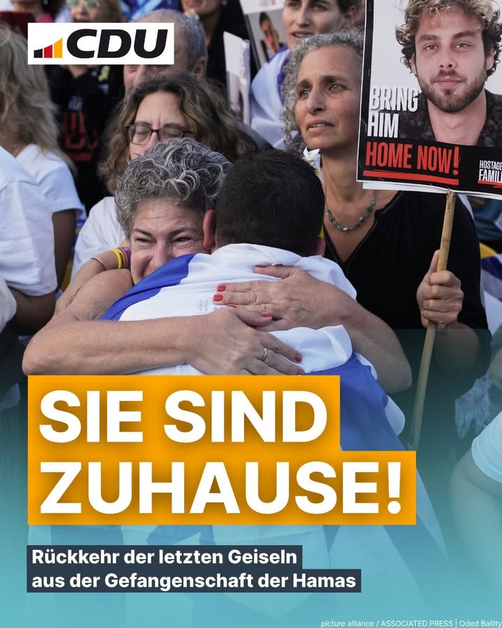 mehr🎗️ Die Bilder aus Israel gehen ans Herz: 738 Tage nach ihrer Entführung kehren heute die letzten Geiseln nach Israel zurück, die am 7. Oktober 2023 von der Hamas entführt worden waren. 738 Tage haben wir mit den Menschen in Israel gehofft, gebangt und getrauert und waren vereint in Solidarität mit den Familien der Geiseln - viele von ihnen auch deutsche Staatsbürger. Heute teilen wir die unendliche Freude über ihre Rückkehr und das Ende des Krieges. Aber in die Freude mischt sich Trauer, denn nicht alle der 48 Geiseln kommen lebend heim. Ein langer Weg der Heilung liegt vor den ehemaligen Geiseln, ihren Angehörigen und den Menschen in Israel, die seit zwei Jahren im Ausnahmezustand lebten. Wir stehen an ihrer Seite. Am Israel Chai - das Volk Israel lebt! 🇮🇱